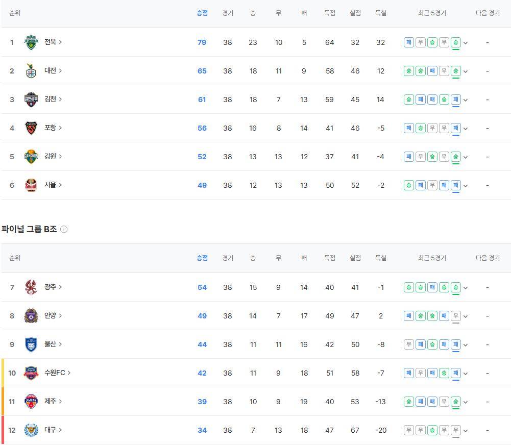 而在争冠组的比赛中,全北现代汽车主场2-1击败FC首尔,以胜利为赛季收官,也为老将崔喆淳送上了最好的退役礼物。而FC首尔则是彻底无缘下赛季的洲际赛场,因为另一场比赛中,江原FC主场1-0击败了无欲无求的浦项铁人,拿到了宝贵的胜利。在事关亚军的争夺战中,最终金泉尚武主场0-3完败于大田韩亚市民,徐进水2射1传成为球队最大功臣,大田也历史性获得了顶级联赛第二的位置。