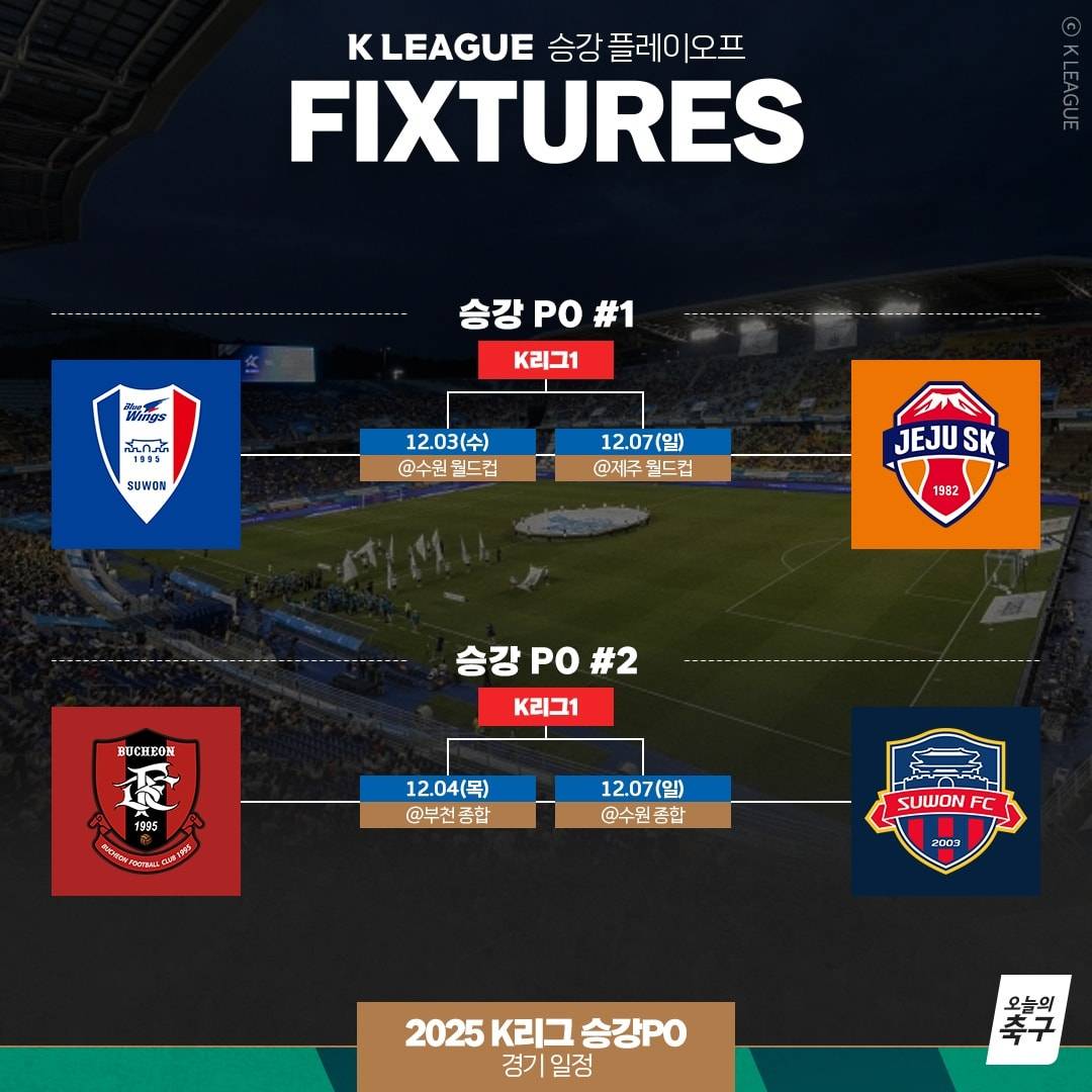 至此,2025赛季K1联赛正式落下帷幕。全北现代汽车夺冠获得亚冠精英联赛参赛资格,大田韩亚市民历史性夺得亚军同样获得参赛资格,浦项铁人获得亚冠精英联赛附加赛资格,江原FC是否获得亚冠2的参赛资格,取决于全北是否在下周末的韩国杯击败光州,如果全北获胜,则江原进军亚冠2,如果全北落败,则光州晋级亚冠2。大邱FC直接降级,济州SK FC、水原FC将参加下周的附加赛,具体对阵如下:(以下均为韩国时间)
