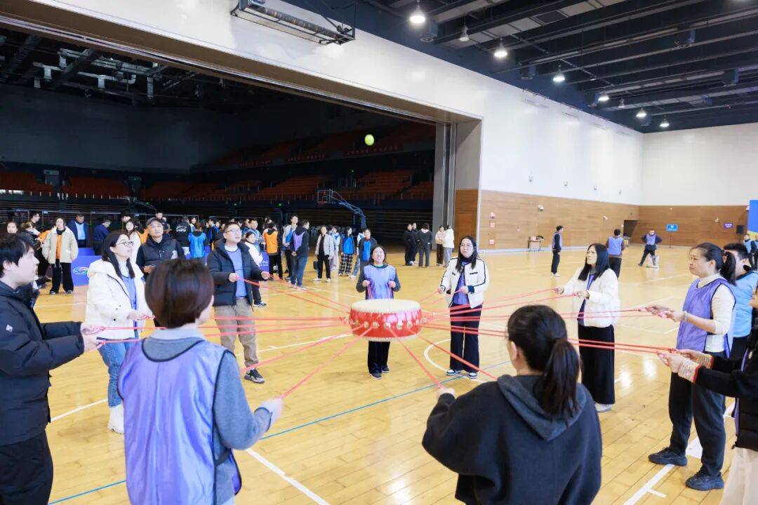 “两人三足”项目则将协作精神展现得淋漓尽致,搭档们绑紧脚踝、同步迈步,在划定的赛道上喊着口号稳步向前,默契的配合与偶尔的踉跄引得观众阵阵加油;“击鼓颠球”项目中,团队成员围握鼓绳,在鼓面共同颠起网球,每一次精准的起落都离不开全员的协调发力,馆内回荡着“一二、一二”的节奏声,凝聚着团队的向心力;