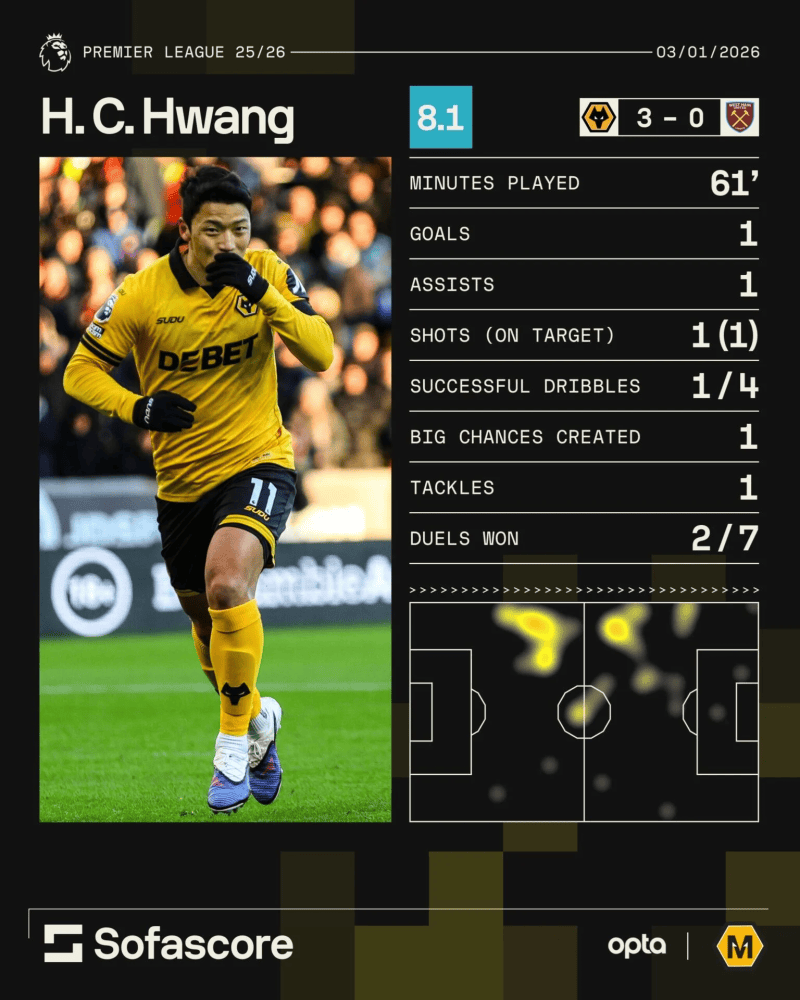 最后我们把目光转向欧洲赛场。2026年率先亮相的英冠球员裴俊浩、严智星、白昇浩都没有取得进球或助攻,但这个遗憾在2天后很快就被打破了!英国当地时间1月3日下午,2025-26赛季英超联赛第20轮一场焦点战在狼队和西汉姆联队身上展开,谁也没有想到,此前联赛一场未胜的狼队,居然会在主场3-0完胜对手,终于拿到了新赛季的首胜。而这场比赛球队的头号功臣,正是韩国前锋黄喜灿!他用一传一射,帮助球队终结了半个赛季的屈辱,也让球队重新看到了希望。