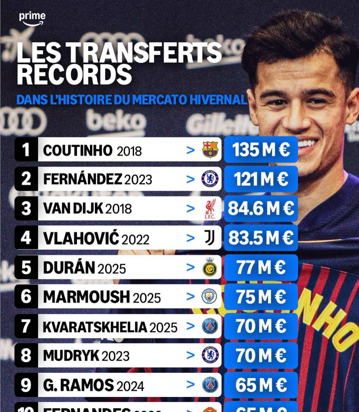 第1位是2018年1月6日,库蒂尼奥以1.35亿欧元从利物浦转会至巴塞罗那,当时他25岁半,是冬窗历史上最贵的引援之一。