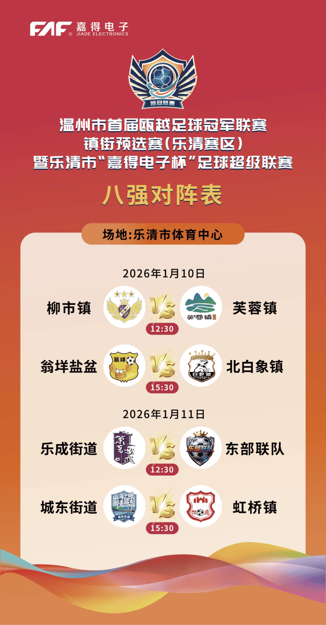 易游体育,易游体育官网,易游体育平台,YY易游,YY易游体育官网,易游体育网址,易游体育入口,易游体育注册,易游体育下载,易游体育app,易游体育app下载,易游app,易游官方网站,易游娱乐经过半个月、22场小组赛的激烈厮杀,温州市首届瓯越足球冠军联赛镇街预选赛(乐清赛区)暨乐清市“嘉得电子杯”足球超级联赛终于迎来淘汰赛。本周末(1月10日至11日),乐清市体育中心将连续上演四场针尖对麦芒的四分之一决赛。柳市、北白象、虹桥等八支代表乐清各乡镇(街道)最高足球水平的草根劲旅,将为一战定胜负的晋级名额,展开最纯粹、最热血的角逐。