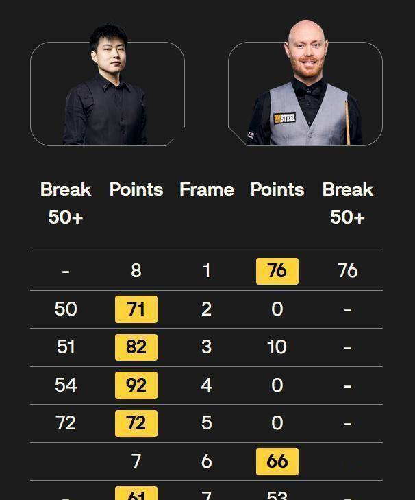 赛场的数据统计冰冷而客观。 赵心童的总得分、进球成功率,肖国栋对阵塞尔比时的开局碾压,吴宜泽那杆熠熠生辉的137分,艾伦行云流水的连续进攻……这些数字和瞬间,共同拼贴出了这个不可思议的凌晨。 八强对阵表上,已经确定将上演一场中国德比,吴宜泽将对阵肖国栋。 这意味着,四强之中,必定会有一张中国面孔。