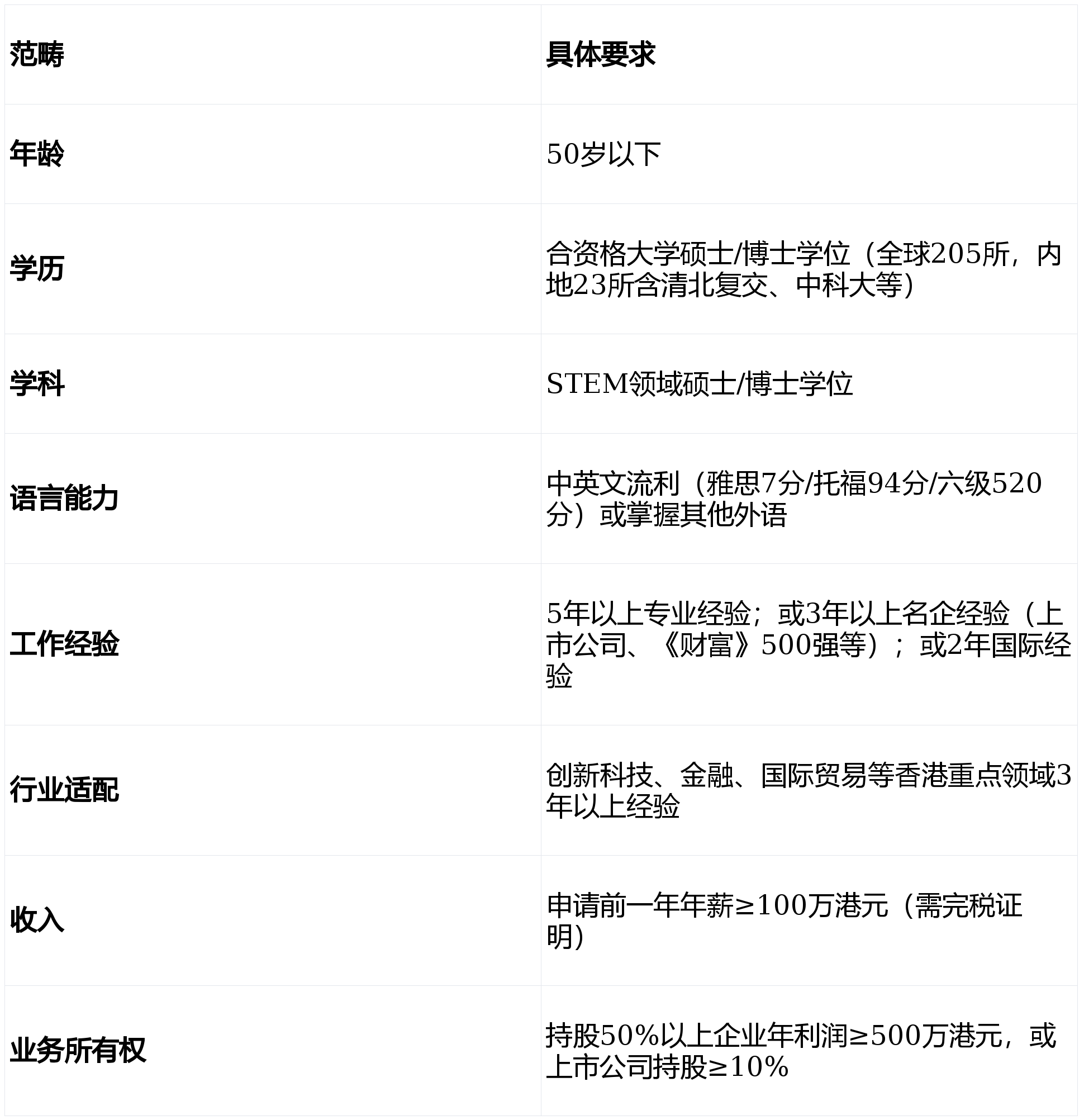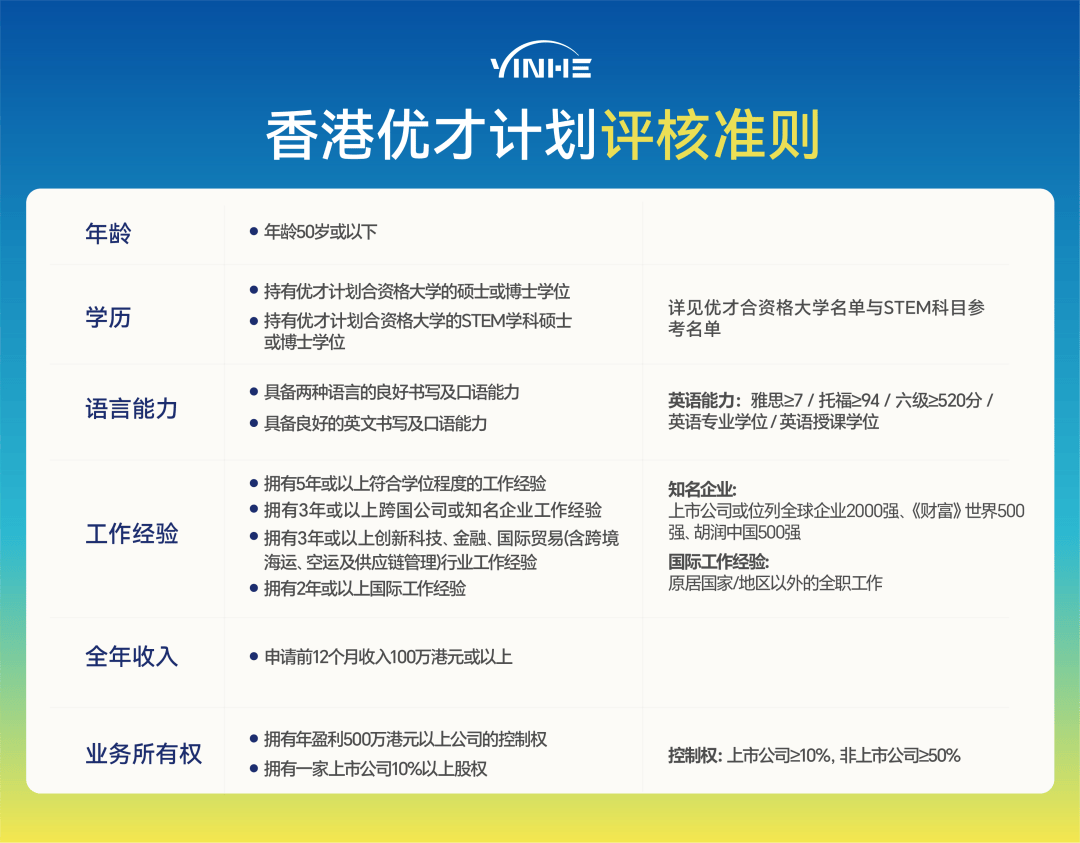 申请阶段采用12项“是否题”评核准则,需满足至少6项才能递交申请,明确倾向高学历(合资格大学硕士/博士)、STEM专业、年薪百万港元以上或名企工作经验等群体。