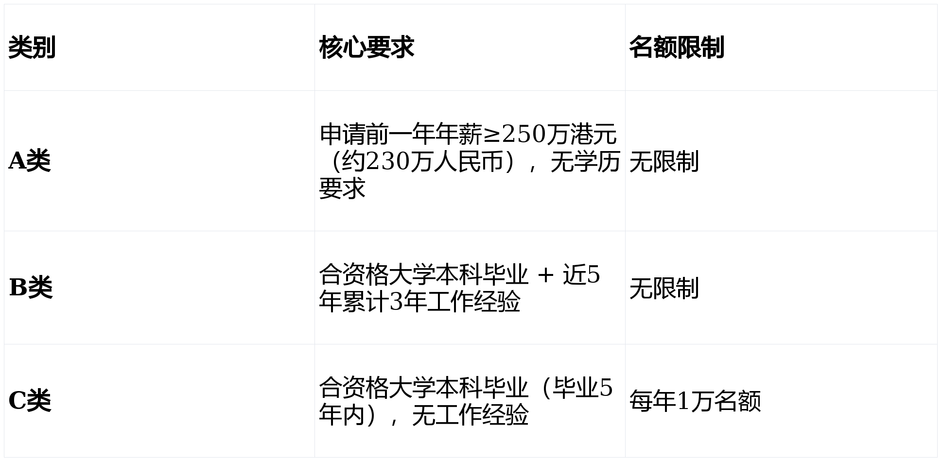 ①逗留期限:根据最新调整,A类人才(高收入人士)的首轮逗留期限已延长至3年;B类和C类人才(名校毕业生)的首轮逗留期限则为2年。