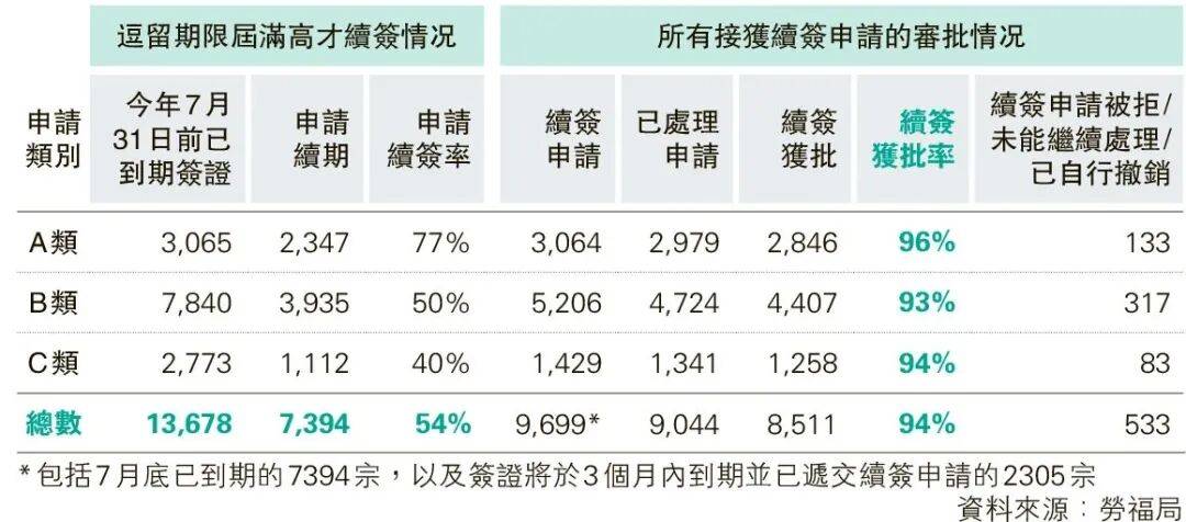 在已处理的19,031宗续签申请当中,17.875宗获批,获批率约94%。