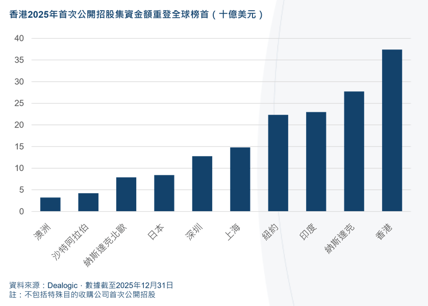 2025年底,香港重登全球新股集资中心榜首,119家新上市公司集资共374亿美元,当中包括全球五大新股的其中两只。全年集资总额更是香港2021年以来的新高,超过前三年总和。