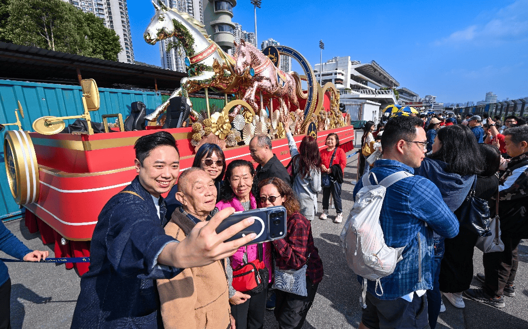 作为很多香港市民过年的传统项目,“马年赛马日”将新春仪式感铺陈至沙田马场的各个角落。马会行政总裁应家柏、马会“马年大使”郭富城和知名艺术家马兴文共同为“融马情国际艺术巡展”揭幕。两匹融马双骏艺术雕塑当天在马场亮相,双骏气势如虹、并肩奔跑,象征马会与社区同行。场内大型桃花林、风车阵错落有致,恰应了“春风得意马蹄疾”的好意头。曾亮相年初一“新春国际汇演之夜”的马会精美花车亦移师场内,万千游客与之合影留念,将维港沿岸的欢腾气息一路延伸至赛道之畔。观众在赛道边观看赛马、振臂呐喊之际,除了能充分感受到马匹拼搏进取的精神外,亦纷纷许下“马到成功”的新年愿望。