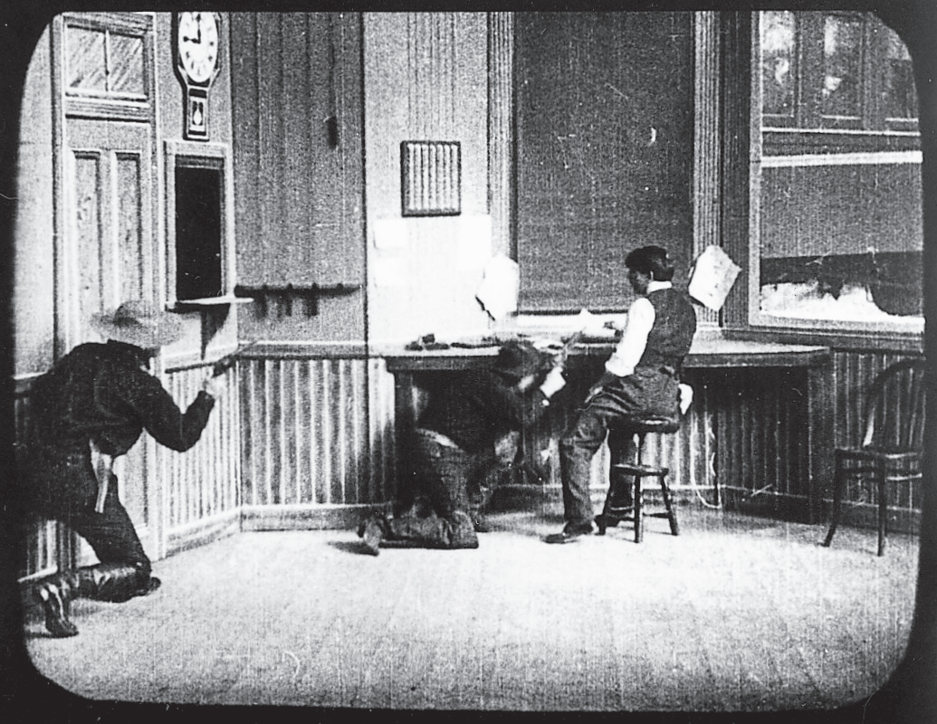 为了制作《火车大劫案》中的这个镜头,波特让胶片曝光两次,展示在摄影棚搬演的大部分抢劫行动,以及另外拍摄的通过窗子看到的火车画面。